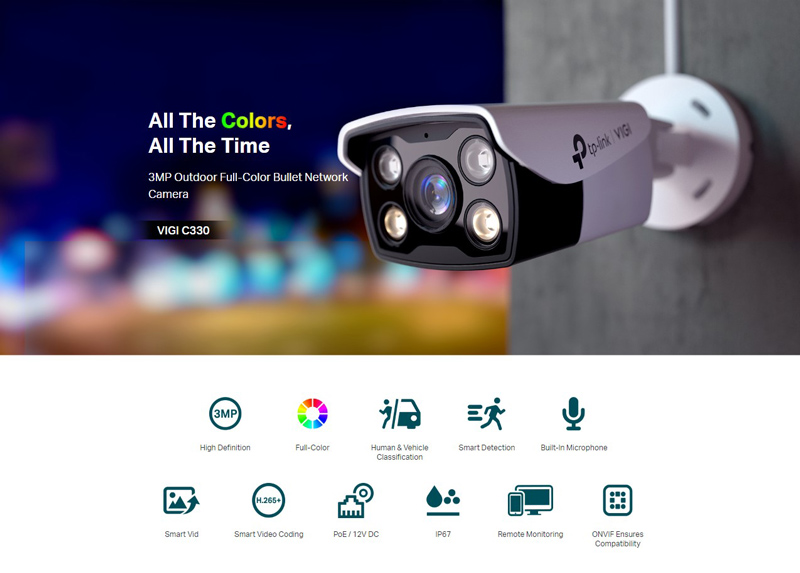 Δικτυακή κάμερα της TP-LINK με φακό 2.8mm και αισθητήρα ανάλυσης 3MP. Υποστηρίζει έγχρωμη νυχτερινή όραση, τροφοδοσία PoE και εξοπλίζεται με εσωτερικό μικρόφωνο για μεταφορά ήχου.