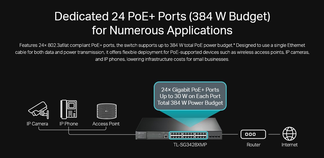 PoE+ Ports(RJ45): Standard: 802.3at/af compliant, PoE+ Ports: 24 Ports, up to 30 W per port, Power Budget: 384 W