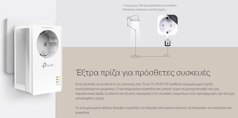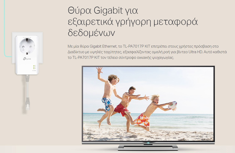 Starter powerline kit της TP-LINK με 2x AV1000 Gigabit passthrough powerline αντάπτορες TL-PA7017P και 2x καλώδια Ethernet.