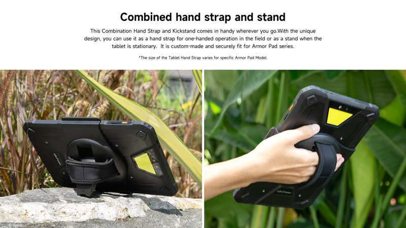 Βάση της Ulefone συμβατή με το tablet Armor Pad 2. Διαθέτει ιμάντα ο οποίος μπορεί να τοποθετηθεί στο χέρι για άνετο και ασφαλές κράτημα του tablet με το ένα χέρι.
