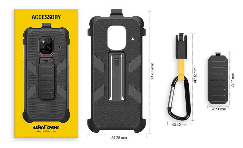 Η θήκη προστασίας της Ulefone για το smartphone Power Armor 14 είναι κατασκευασμένες από αντιολισθητικό και ανθεκτικό υλικό στις πτώσεις, που δεν χαράσσεται και δεν κάνει δαχτυλιές. Μαζί με την θήκη συμπεριλαμβάνονται, ένα περιστρεφόμενο κλιπ 180° που μπορεί να τοποθετηθεί σε ζώνη και ένα κλιπ με γάντζο που μπορεί να κρεμαστεί σε ζώνη ή σακίδιο.