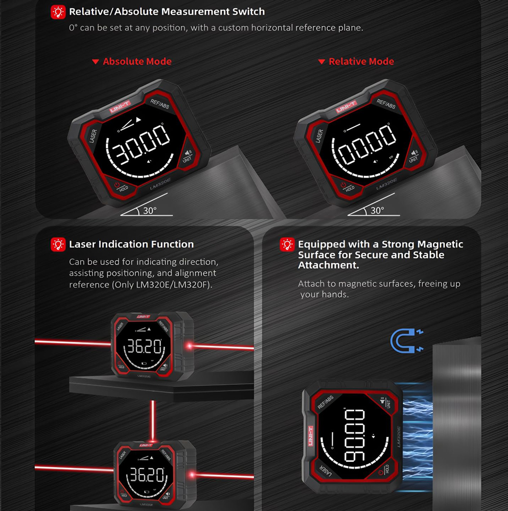 Τα ψηφιακά γωνιόμετρα της σειράς LM320 είναι απαραίτητα εργαλεία μέτρησης για πολλούς τομείς εργασίας, όπως η ξυλουργική, η διακόσμηση κτιρίων, εργασίες πολιτικών μηχανικών κ.α.