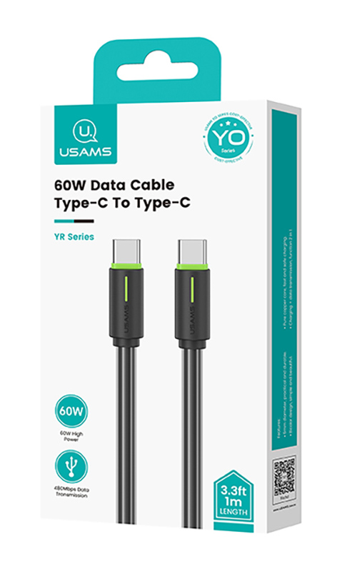 Καλώδιο φόρτισης και μεταφοράς δεδομένων USB-C σε USB-C της Usams. Υποστηρίζει φόρτιση με απόδοση έως 60W και μεταφορά δεδομένων με ταχύτητα έως 480Mbps.