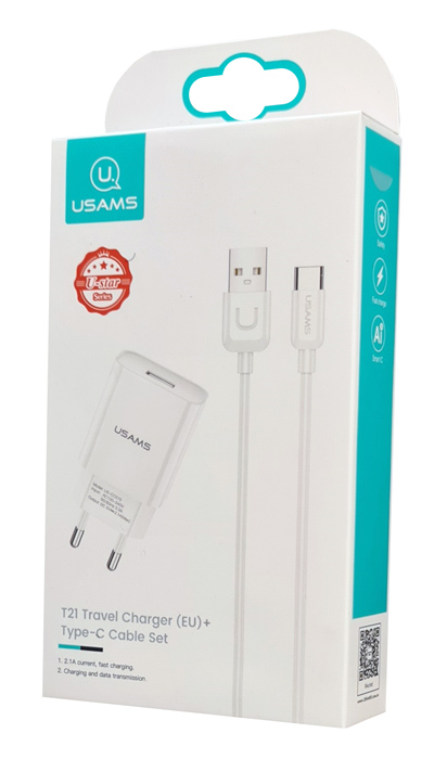 USAMS φορτιστής τοίχου T21OCTC01 με καλώδιο USB-C, USB 2.1A, λευκός
